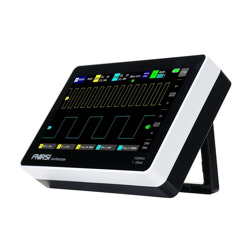 Le FNIRSI 1013D est un oscilloscope portable pratique pour l’analyse précise des signaux analogiques et numériques. L’écran TFT capacitif de 7 pouces (800 × 480) offre un affichage net des formes d’onde, un zoom rapide et un réglage intuitif des paramètres. Deux canaux indépendants avec impédance d’entrée de 1 MΩ permettent la comparaison simultanée des signaux, y compris l’analyse des figures de Lissajous en mode XY.
