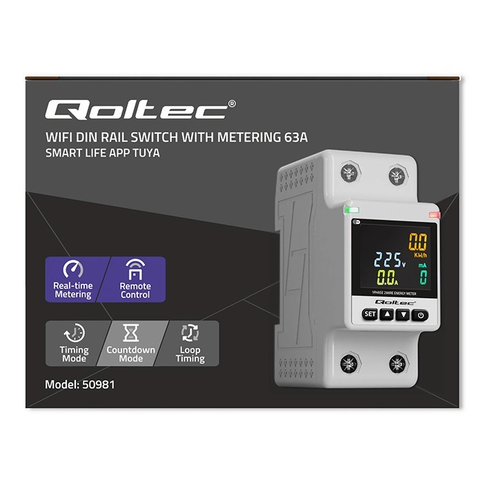 Compteur électrique intelligent monophasé avec Wi‑Fi et application TUYA / Smart Life, permettant de suivre la consommation d’énergie en temps réel, de mesurer la tension, le courant, la puissance, l’énergie (kWh) et le courant de fuite, et de contrôler l’alimentation manuellement et à distance. Grâce à un écran LCD clair, à l’historique des mesures et à des protections automatiques, vous optimisez facilement les coûts et protégez votre installation.