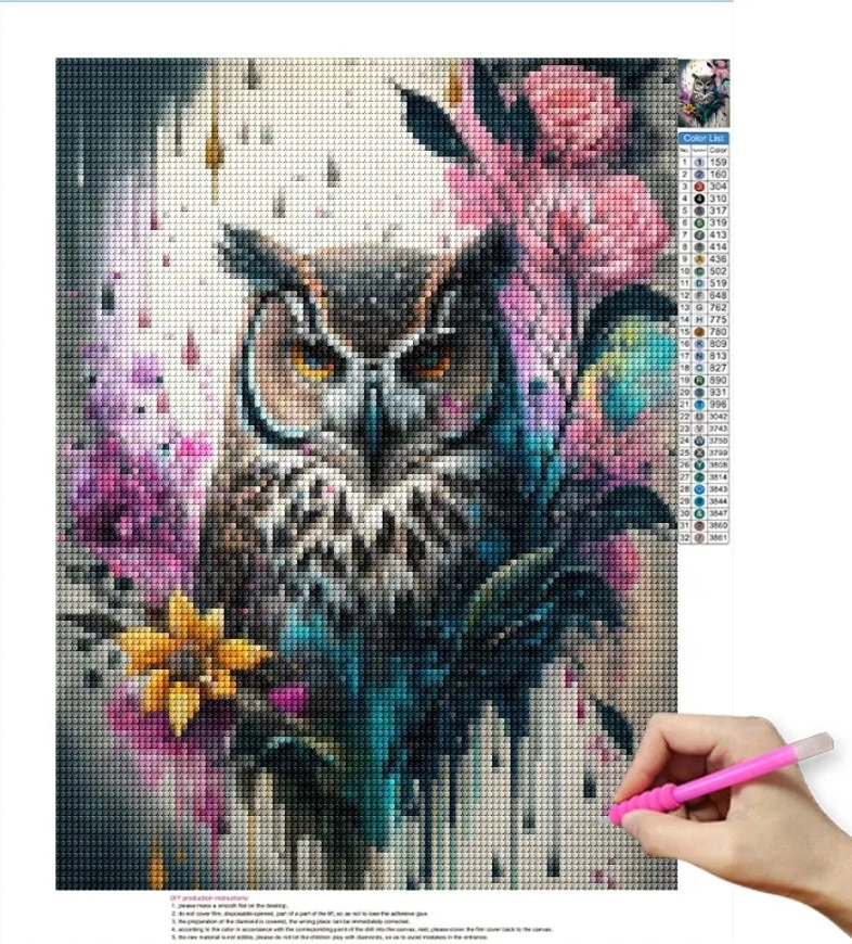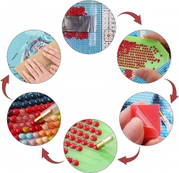 Ce kit complet comprend une toile imprimée autocollante, des strass colorés, un applicateur avec cire et un plateau de tri. Il suffit de découvrir le film protecteur par sections, de prendre les strass avec la pointe cirée et de les poser précisément selon la légende. Cette activité développe patience, précision et motricité fine et convient aux adultes et aux enfants sous surveillance.