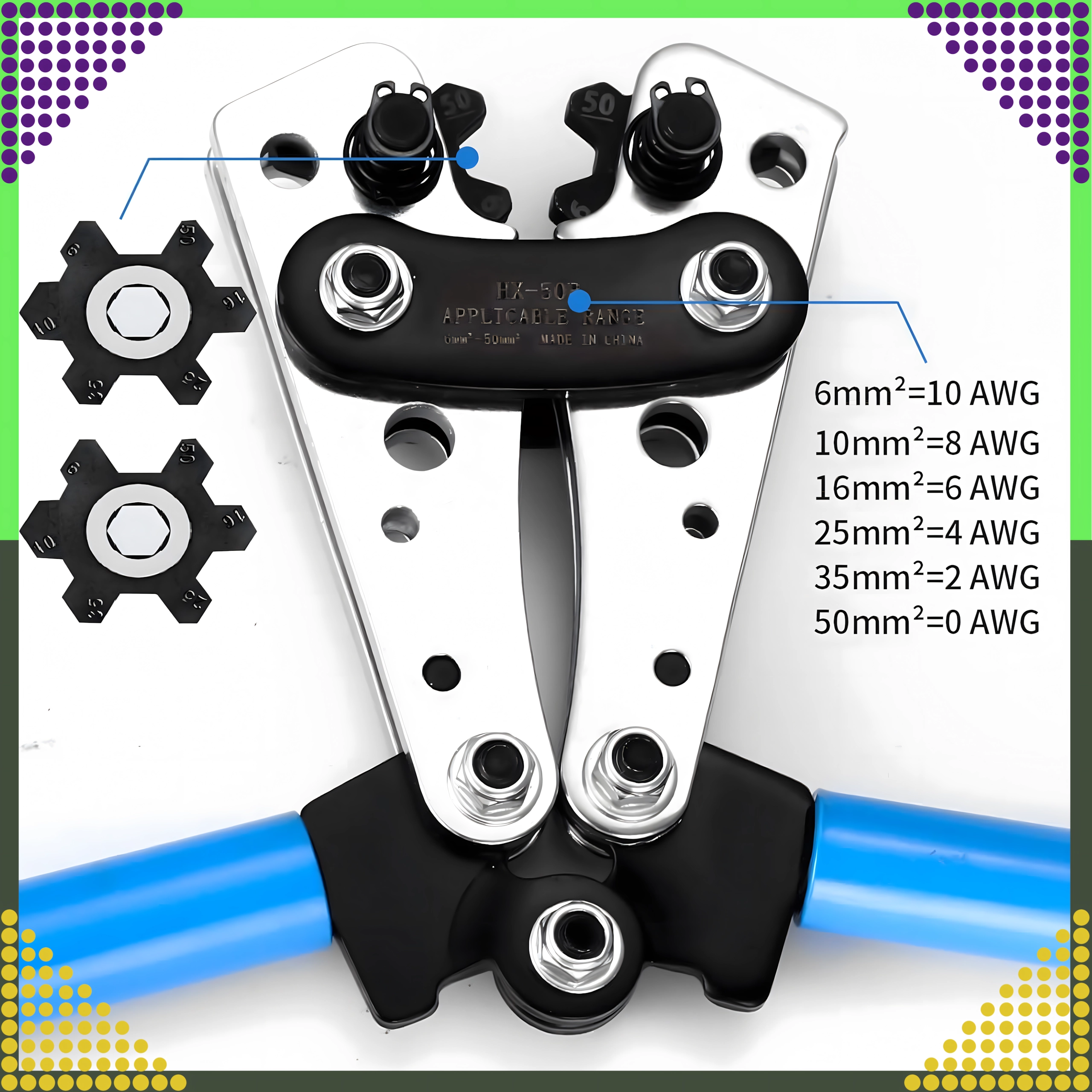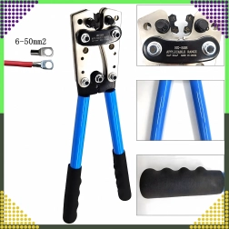 Presse manuelle fiable pour cosses et embouts de câbles pour sections 6–50 mm², offrant un sertissage rapide, solide et précis. Grâce à sa longueur de 390 mm, à ses longs bras avec poignées antidérapantes et à sa construction en acier, elle convient à un usage professionnel comme domestique. La matrice hexagonale (HEX) et le changement de taille facile garantissent une connexion électrique sûre des conducteurs Cu et Al.
