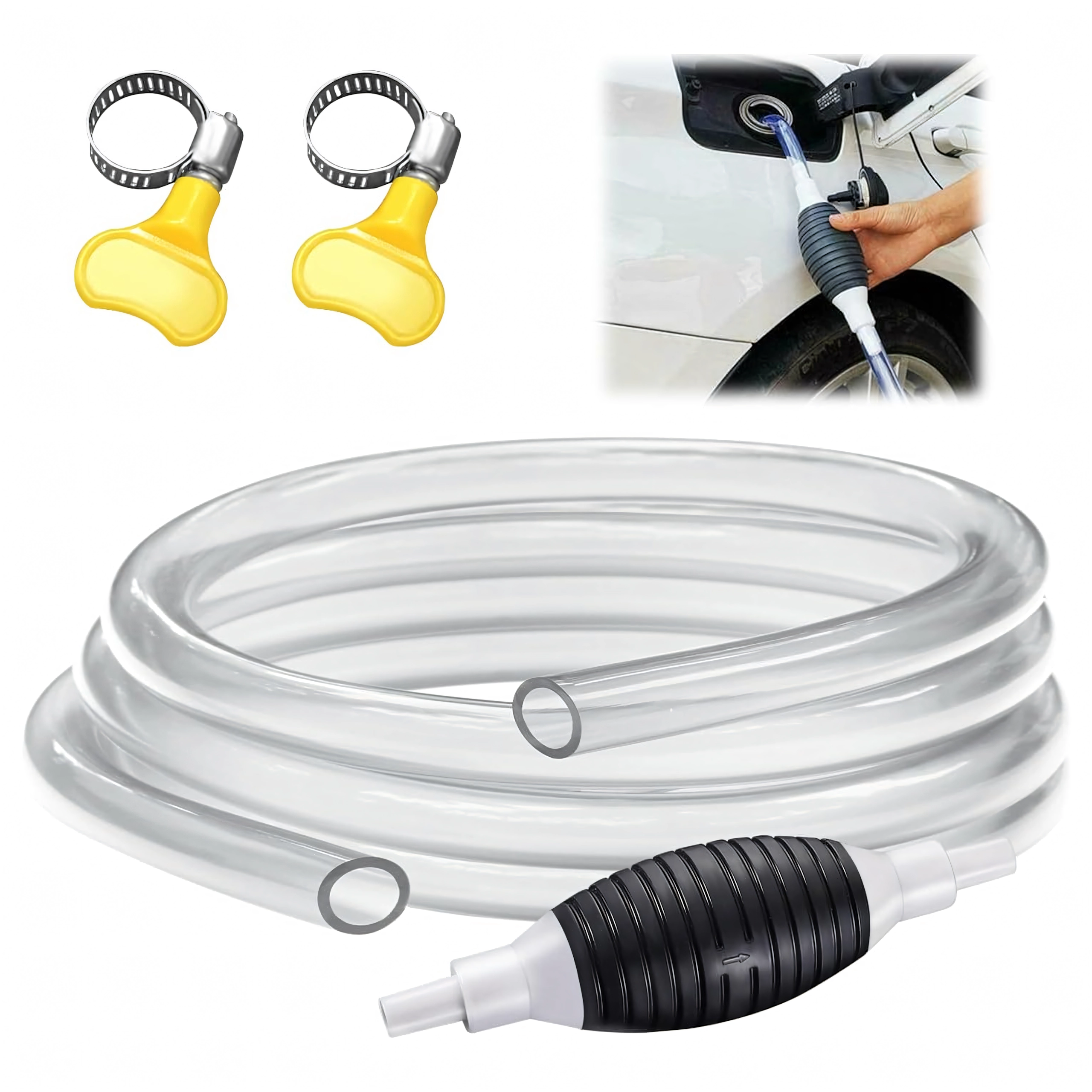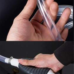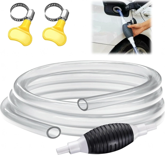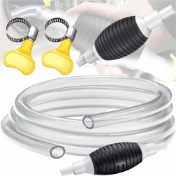 La poire d’amorçage crée immédiatement une dépression et lance l’écoulement sans éclaboussures. Le tuyau transparent permet de contrôler le flux et d’éviter le débordement.