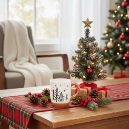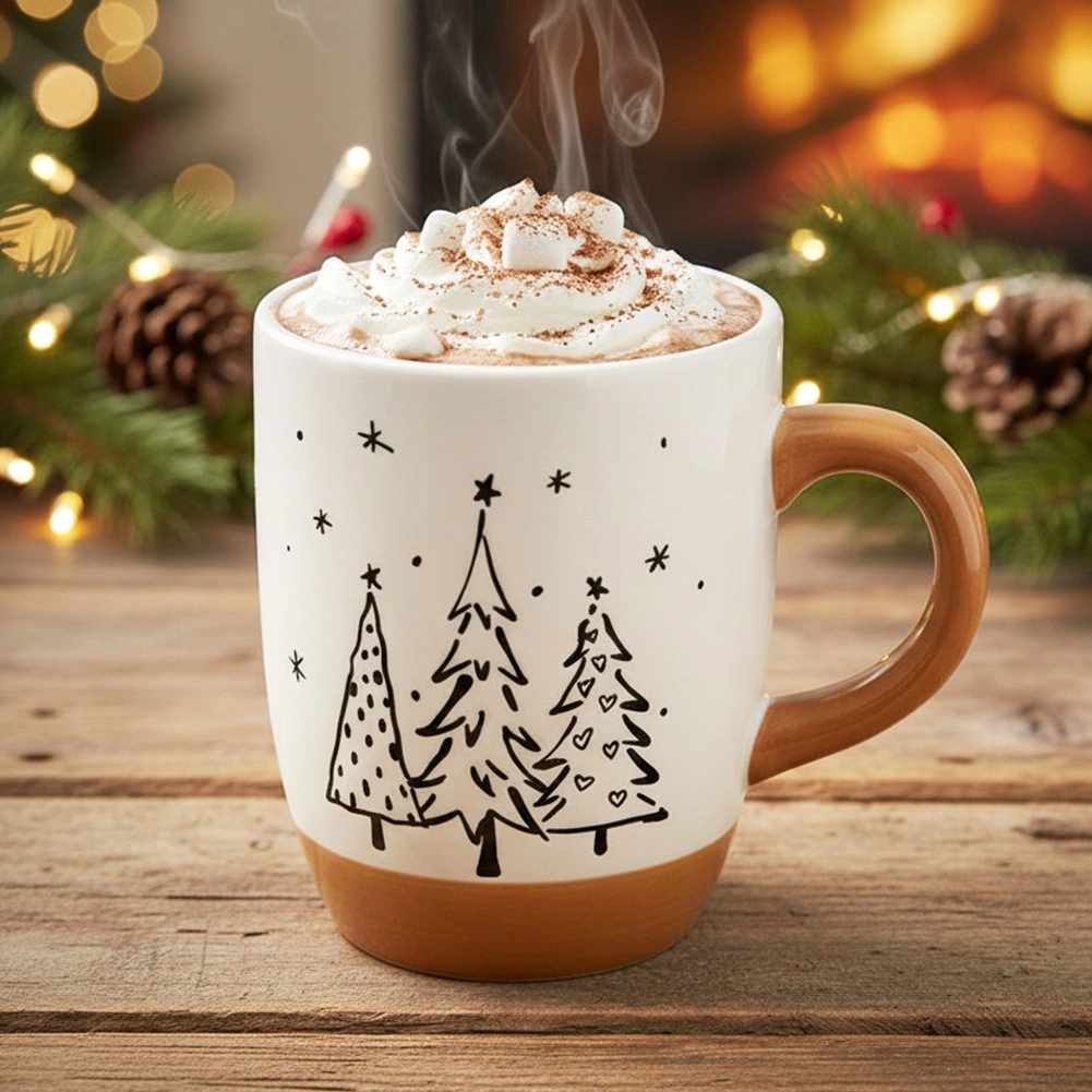 Un mug blanc avec des sapins noirs et une base beige qui apporte du style aux boissons d’hiver et crée une agréable ambiance festive.