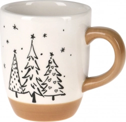 - Blanc avec anse et partie inférieure beiges, impression noire de sapins