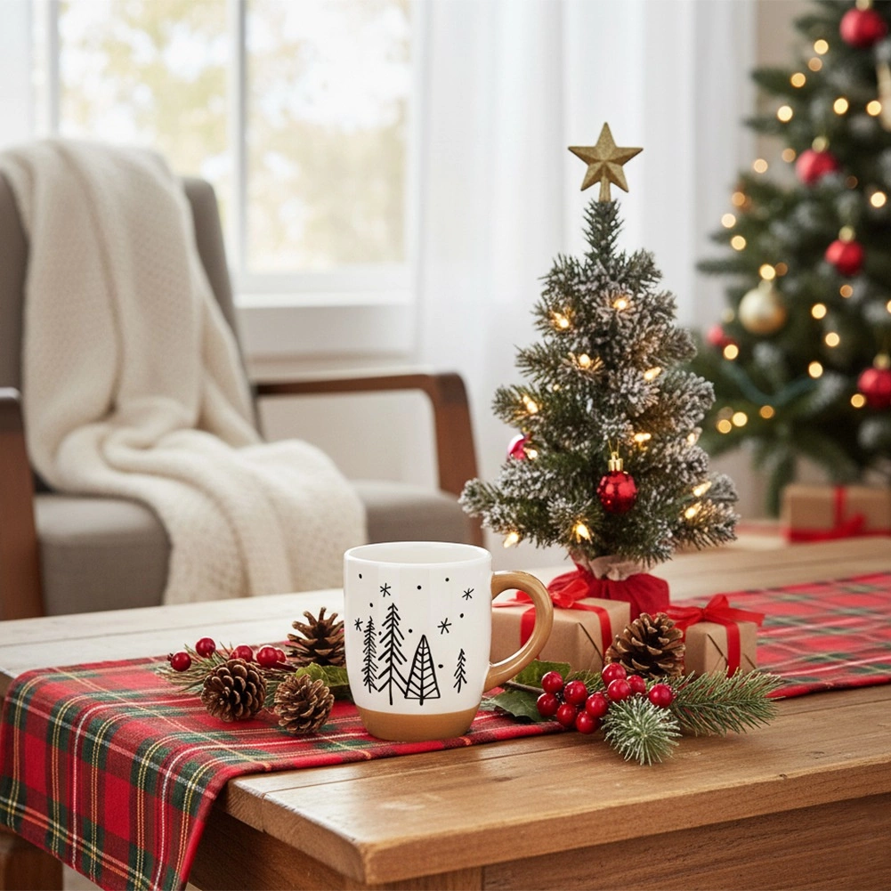 Apportez une atmosphère festive chez vous avec ce mug en céramique élégant orné de sapins minimalistes. L’association d’une glaçure blanche avec une anse et une base beiges offre une allure raffinée et intemporelle, convenant à toutes les tables.