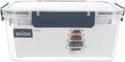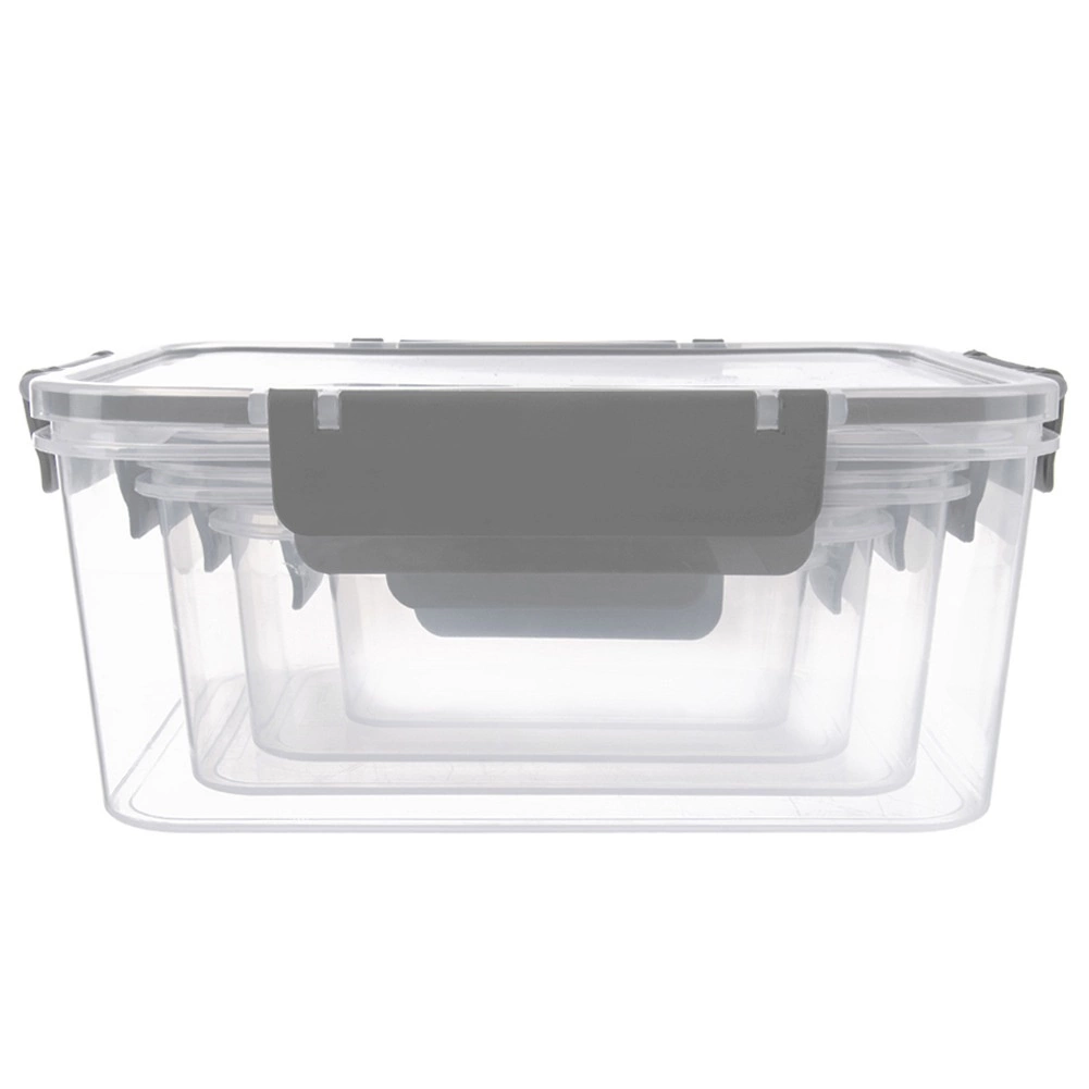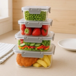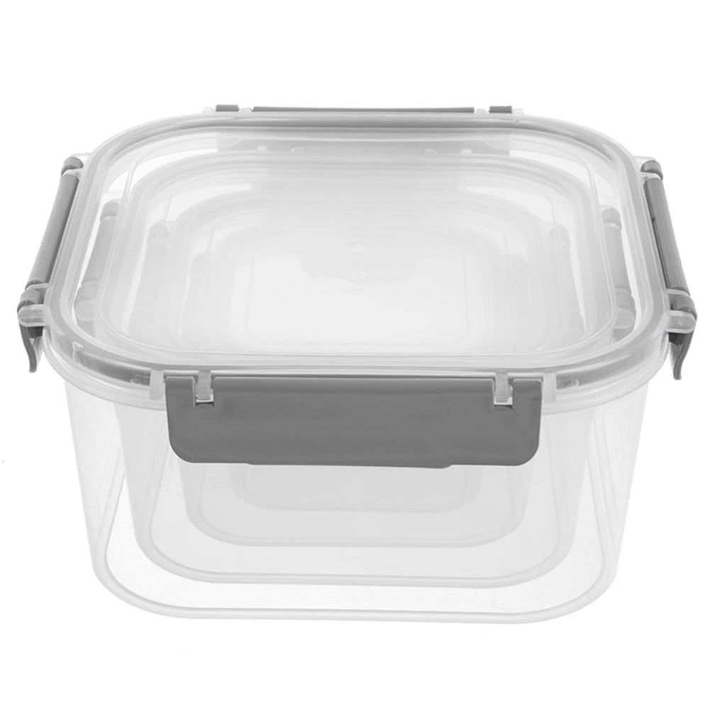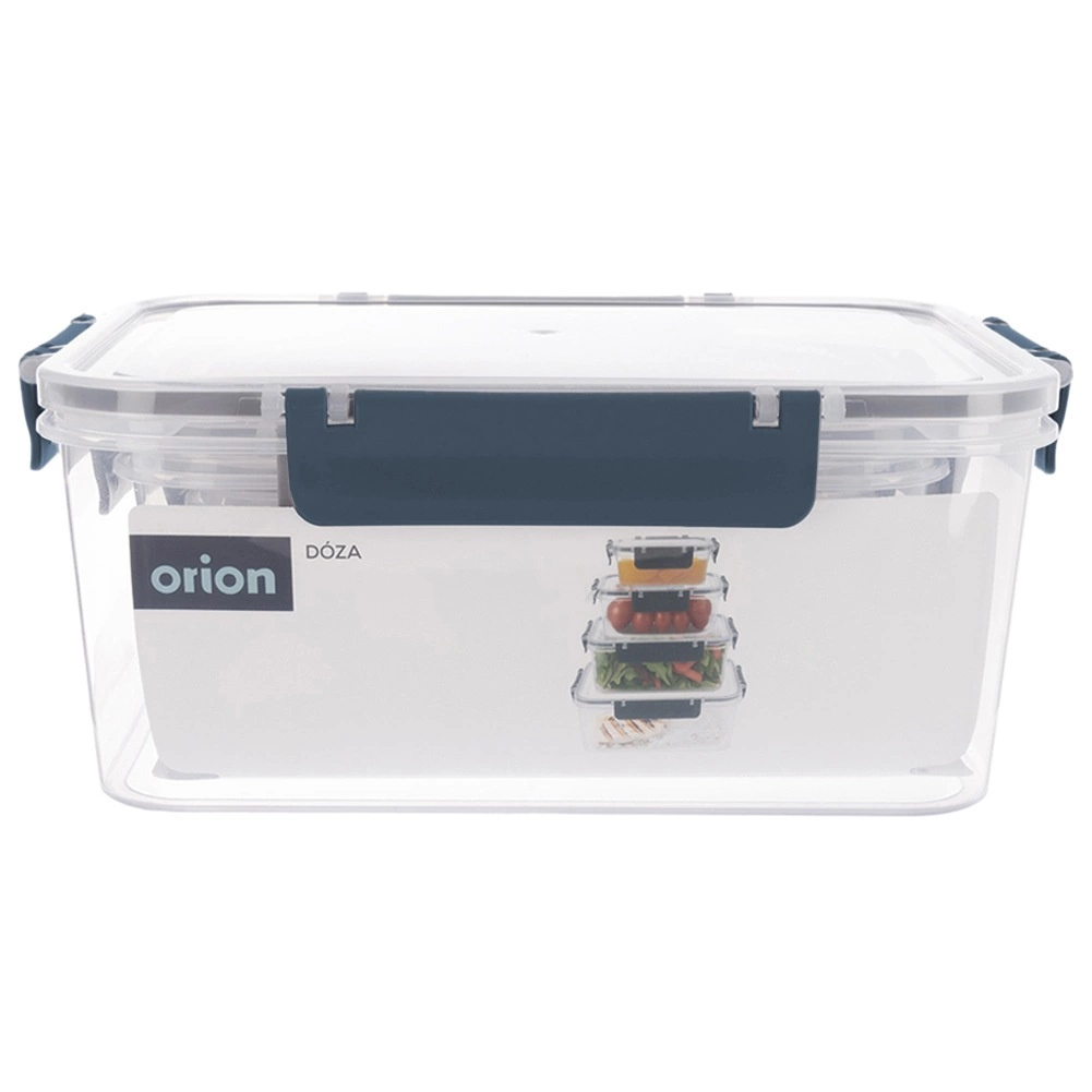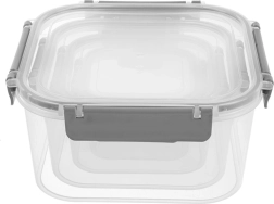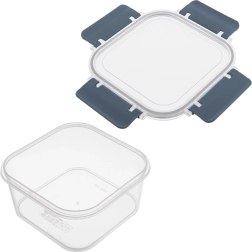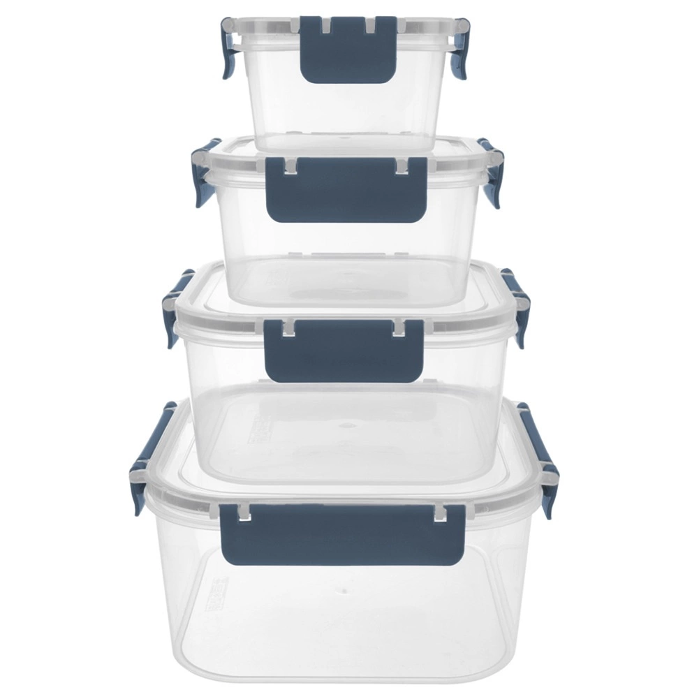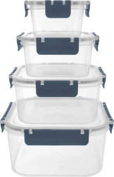 Le set comprend quatre boîtes carrées de 400 ml, 900 ml, 1,8 l et 2,9 l. Grâce au corps transparent, vous voyez rapidement le contenu, tandis que le joint en silicone et les quatre clips robustes garantissent une fermeture fiable et étanche sans fuite. Les boîtes plus petites peuvent être placées dans la plus grande, occupant ainsi un minimum d’espace dans le placard.