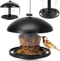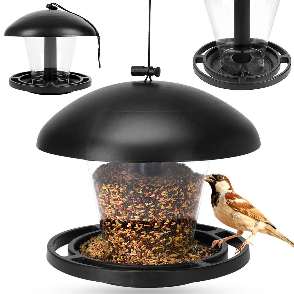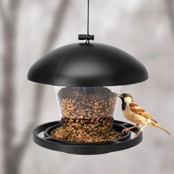 Le large couvercle en forme de dôme protège les graines de l’humidité et aide à garder la nourriture fraîche même par mauvais temps.