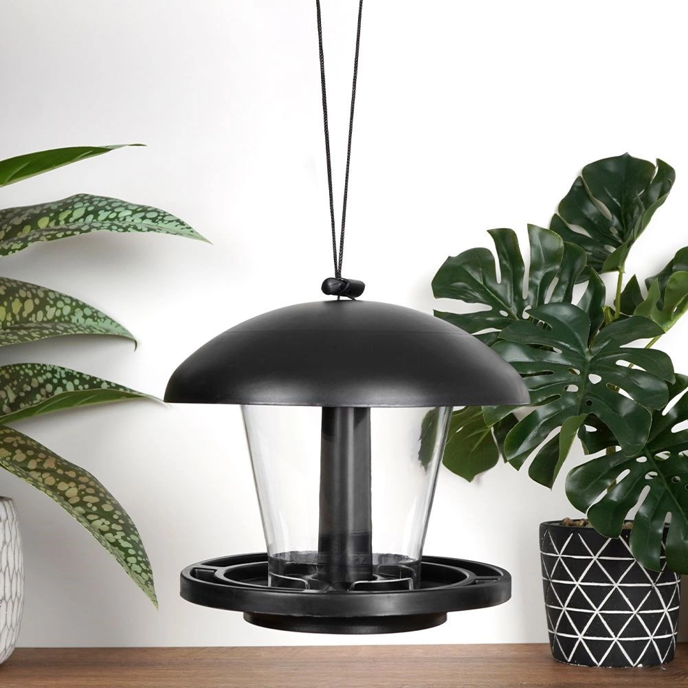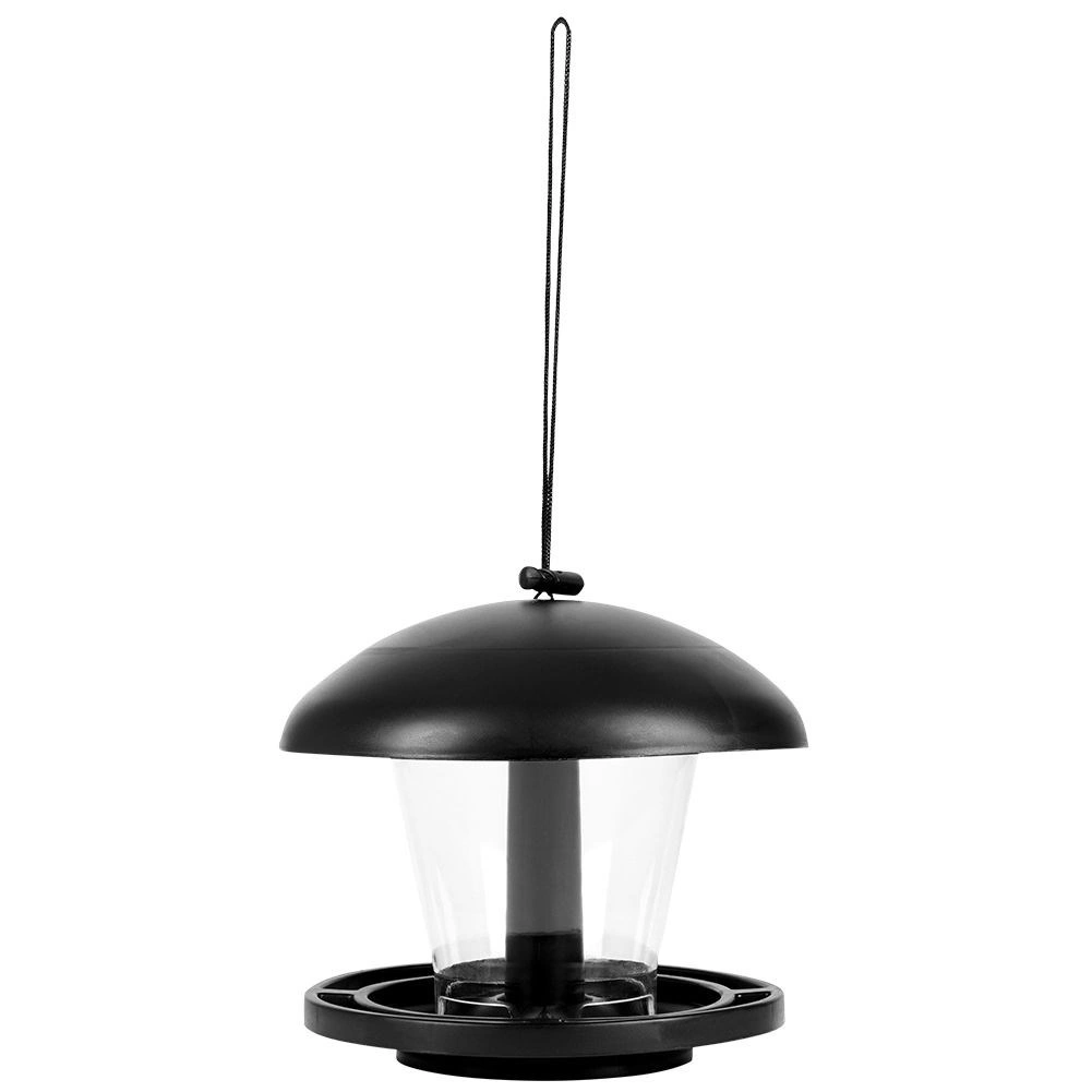 Mangeoire suspendue élégante pour oiseaux de 19 × 19 × 16,5 cm avec réservoir transparent et toit noir, offrant une protection fiable contre la pluie, un contrôle facile de la quantité de nourriture et un perchoir confortable pour les oiseaux. Grâce à sa corde solide, elle se suspend facilement à un arbre ou à un crochet de balcon.