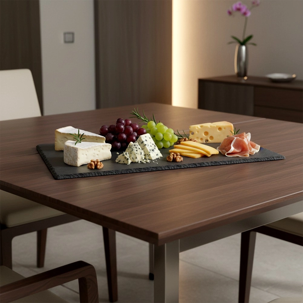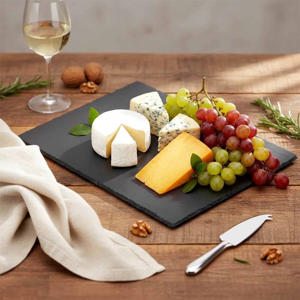 La planche est fabriquée en pierre d’ardoise naturelle, reconnue pour sa durabilité et sa retenue thermique – vous pouvez la refroidir avant utilisation pour les mets froids ou la préchauffer délicatement pour des délices chauds. Le dessous est doté de patins antidérapants qui protègent la table des rayures et assurent la stabilité lors de la découpe et du service.