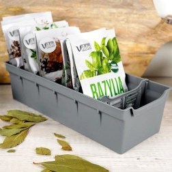 L’organisateur est fabriqué en plastique de qualité, résistant dans une élégante couleur grise. À l’intérieur, vous trouverez cinq cloisons amovibles qui divisent l’espace en six sections – vous créez ainsi facilement des zones pour différents types d’épices et trouvez rapidement exactement ce qu’il vous faut. Parfait non seulement pour les sachets fermés, mais aussi entamés.