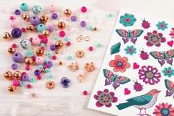 Le coffret comprend un élastique pour l’enfilage, 90 perles tendance, 3 breloques avec anneaux et une planche de tatouages temporaires. Un guide illustré et intuitif, étape par étape, permet une création facile même pour les débutants.