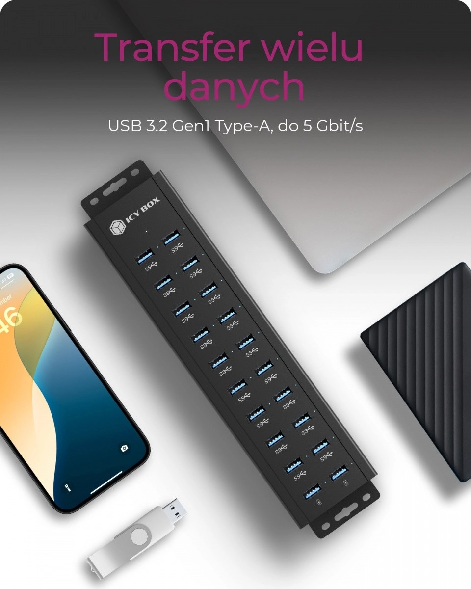 Le hub USB 20 ports Icy Box IB-HUB1720-U3 puissant étend votre connectivité au maximum : il offre 18× USB-A 3.2 Gen 1 pour les données jusqu’à 5 Gbit/s et 2 ports de charge USB-A dédiés de 15 W. Grâce à son interrupteur marche/arrêt, à un adaptateur secteur fiable de 96 W et à des supports de montage, il est idéal pour les bureaux, ateliers et usages professionnels.