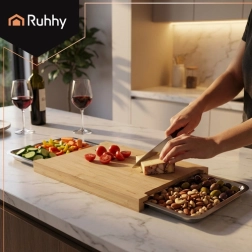 La pratique planche en bambou RUHHY avec deux bacs coulissants en acier inoxydable rend la préparation des repas plus agréable. Elle offre une grande surface de travail de 40 × 28,5 cm, une organisation rapide des ingrédients sans désordre et un bambou durable et hygiénique. Les bacs sont résistants à la chaleur, peuvent être utilisés au four et lavés au lave-vaisselle – idéal pour une cuisine rapide à la maison comme en restauration.