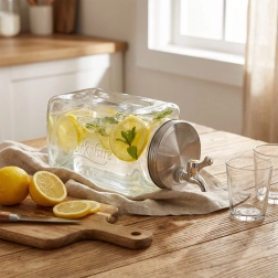 Distributeur de boissons en verre élégant de 3,3 l avec robinet pratique, idéal pour servir limonades maison, eau aromatisée aux fruits ou thé glacé. Grâce à sa forme plate, vous pouvez le poser facilement sur une étagère du réfrigérateur, et sa large ouverture permet un remplissage et un nettoyage confortables. Verre épais et résistant, couvercle en acier inoxydable et fermeture vissée étanche protègent la boisson des impuretés et des insectes, tandis que le robinet pratique assure un service propre sans gouttes.