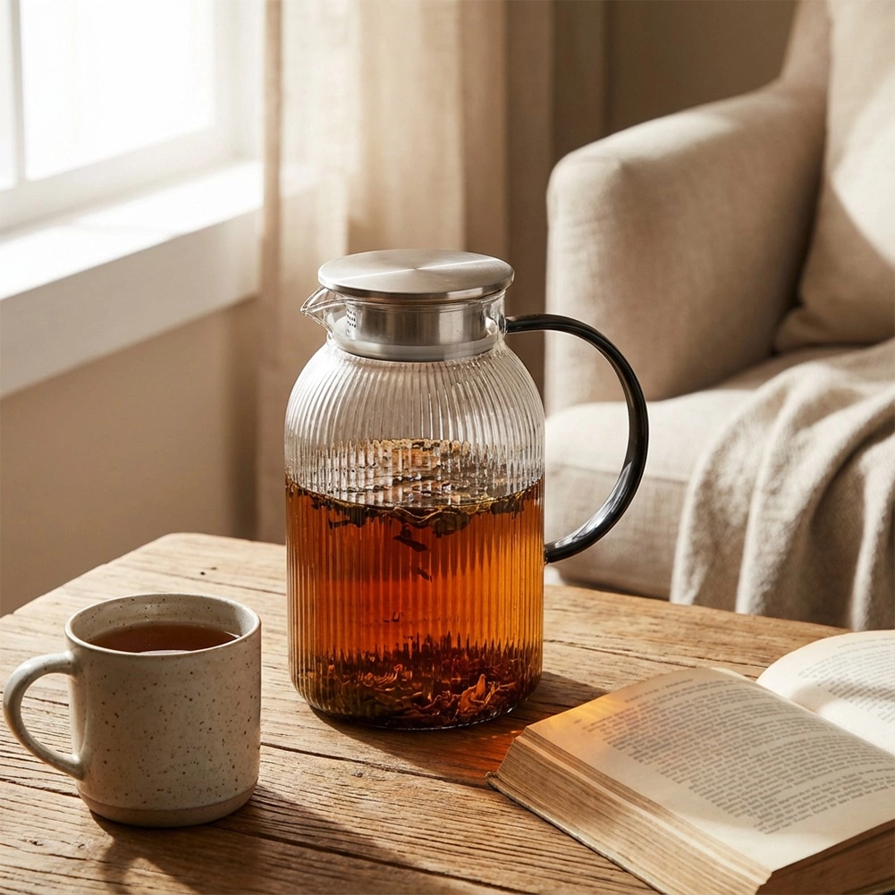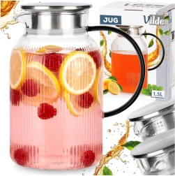Carafe stylée pour eau, limonade ou thé glacé, alliant look moderne et fonctionnalité. Le verre transparent rainuré met en valeur la couleur des boissons, tandis que le couvercle en inox à teinte dorée protège le contenu et permet un service pratique à l’abri des impuretés.
