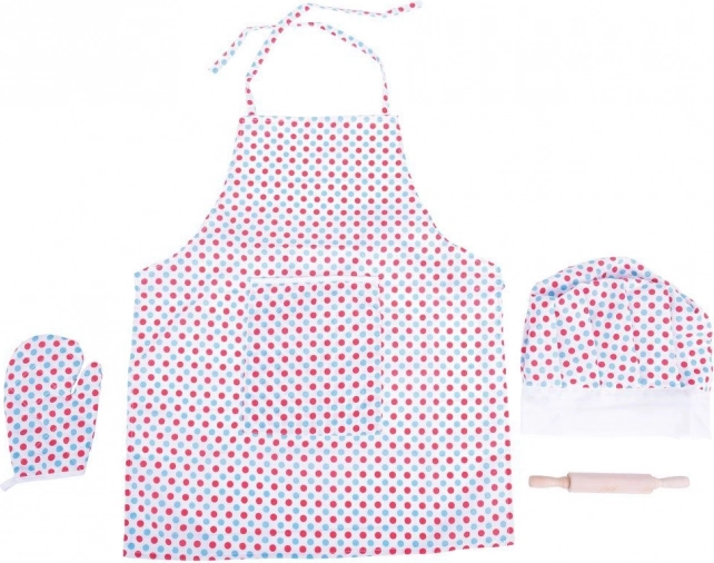 Offrez aux petits chefs tout ce dont ils ont besoin pour leurs premières pâtisseries et pour des jeux de cuisine amusants. Le tablier à pois en tissu léger protège les vêtements, la toque de chef s’ajuste facilement grâce au velcro et le rouleau en bois avec des emporte-pièces en métal stimule la créativité et le plaisir de créer.