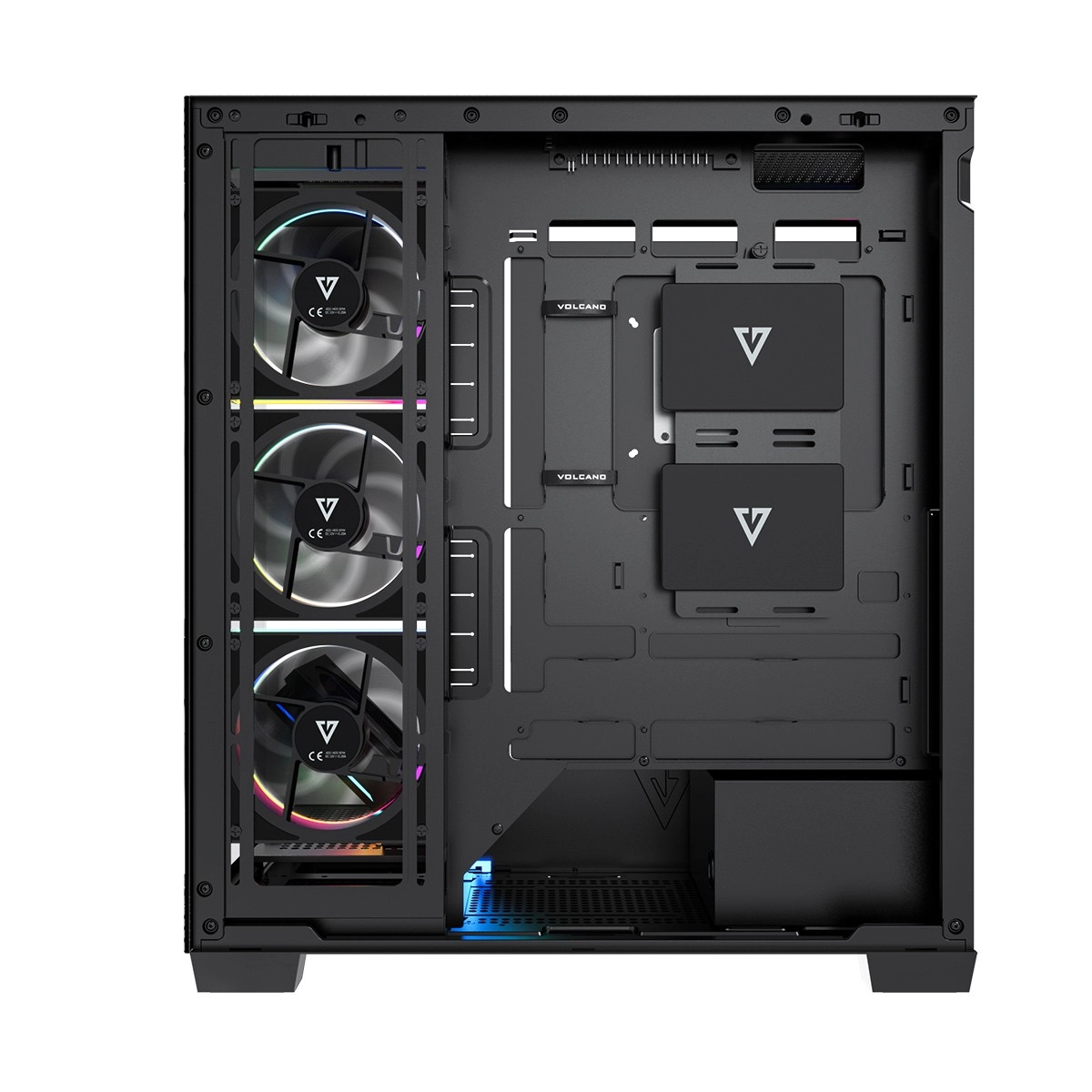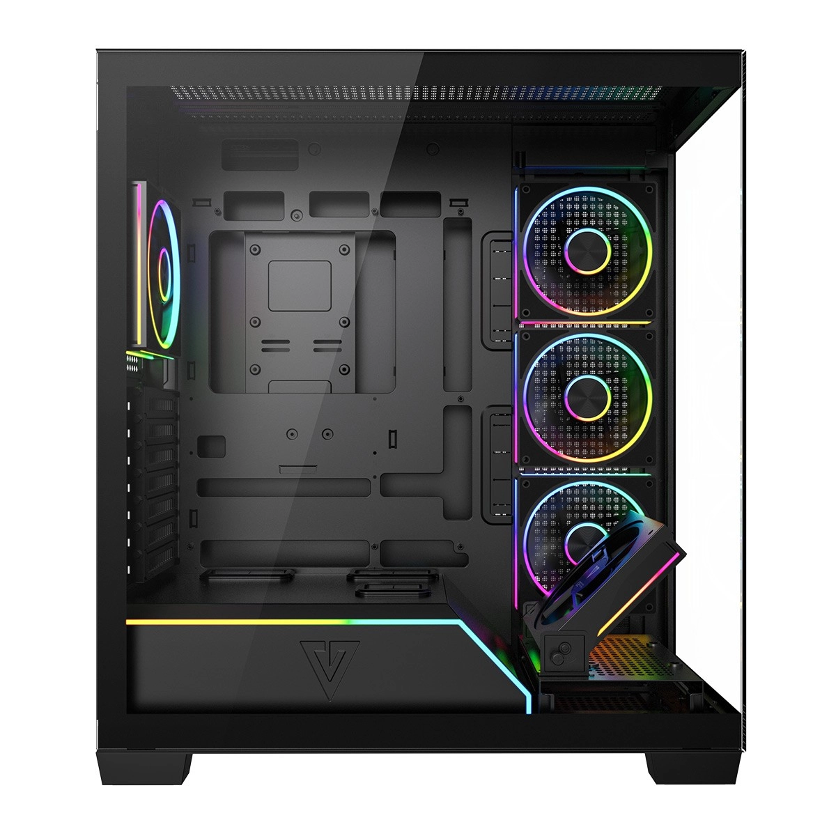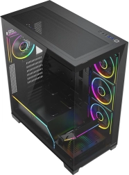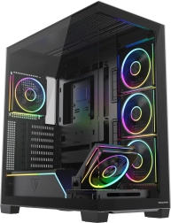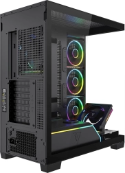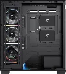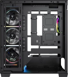 Équipé d’usine de 5× ventilateurs ARGB 120 mm (dont 3 à pales inversées près du plateau de la carte mère) assurant un refroidissement puissant et des effets spectaculaires. Le contrôleur pour jusqu’à 6 ventilateurs permet d’harmoniser facilement l’éclairage avec toute la configuration.
