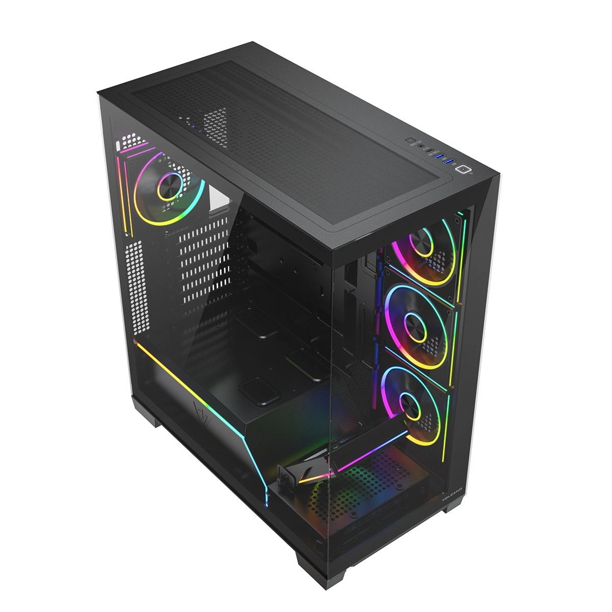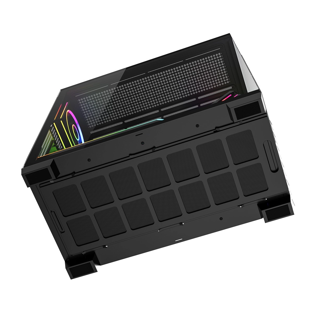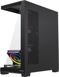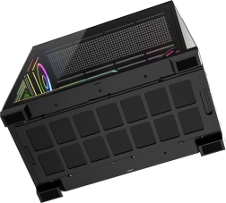 Le boîtier est prêt pour les configurations modernes : prise en charge ATX/M‑ATX/ITX, compatibilité avec les cartes mères à connecteurs inversés (BTF), espace pour un ventirad jusqu’à 175 mm et une GPU jusqu’à 420 mm, plus la possibilité de montage vertical. Le panneau E/S supérieur apporte USB 3.0, USB‑C, audio combo et un bouton pour modifier l’éclairage. Grâce aux emplacements pour radiateurs jusqu’à 360 mm en haut et sur le côté et 120 mm à l’arrière, vous construirez aisément une machine silencieuse et performante.