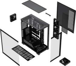Des détails pratiques simplifient le montage et l’entretien : panneau latéral à clip sans outils, équerres PCIe vissées (7), support rabattable pour ventilateur 120 mm soufflant directement sur la GPU et un emballage incluant un chiffon pour verre, un tournevis et une boîte à vis. À l’intérieur, vous trouverez un stockage flexible pour disques 2,5" et 3,5" et suffisamment de place pour une alimentation jusqu’à 230 mm.