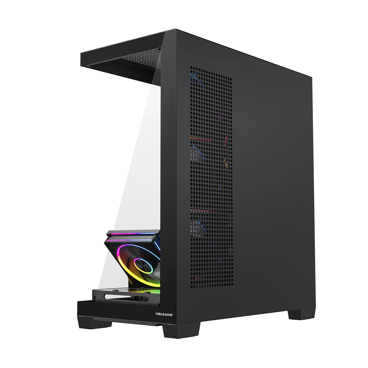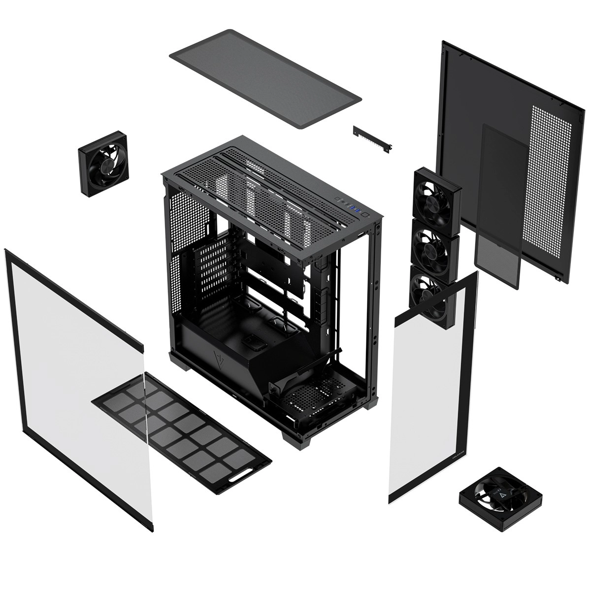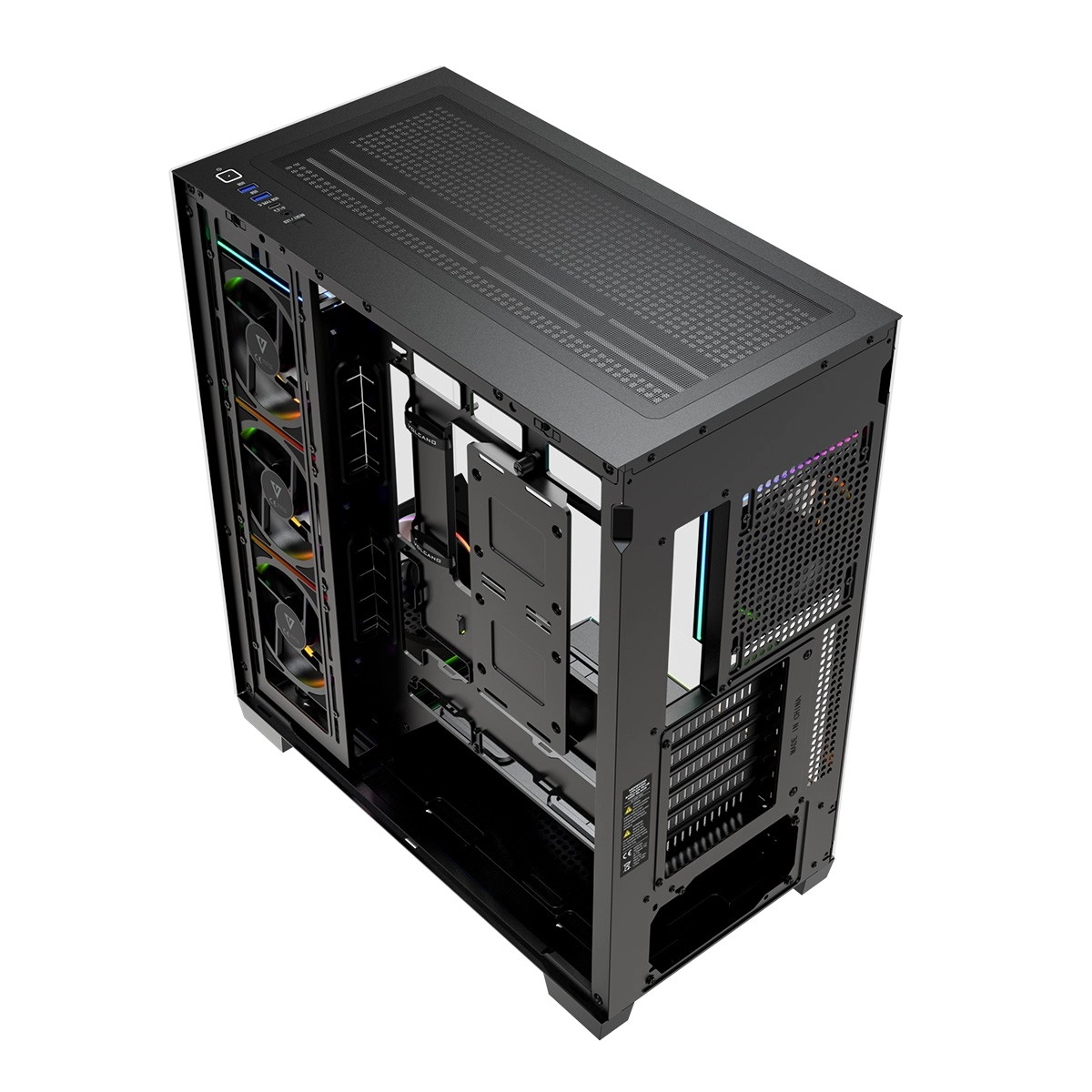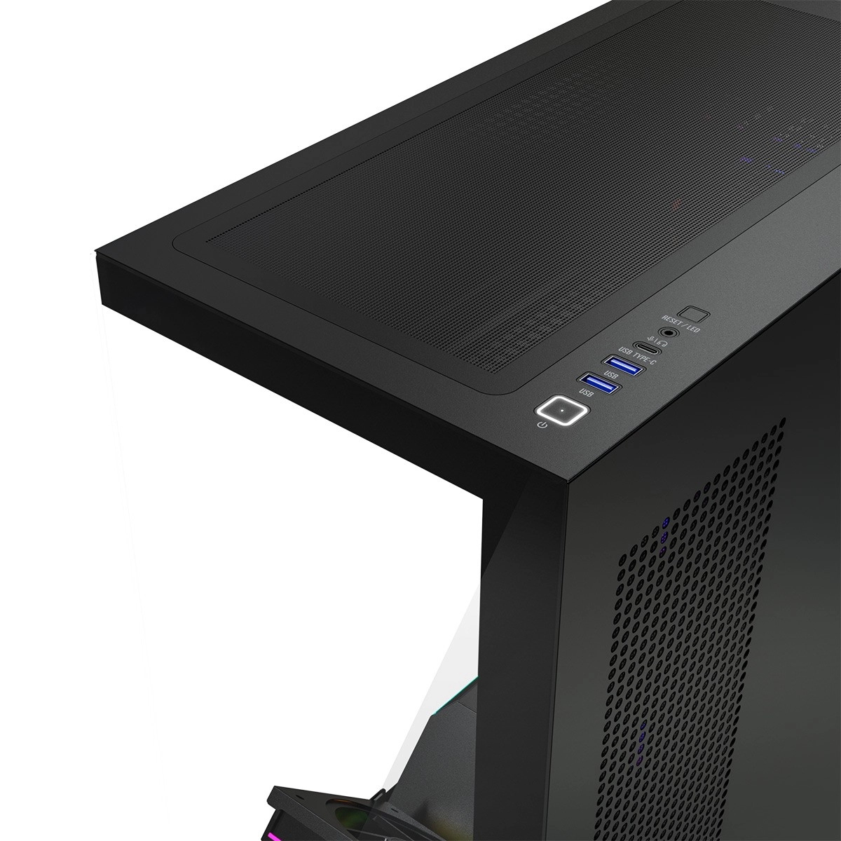 De larges surfaces d’aération, un support de ventilateur rabattable pour le refroidissement du GPU et des filtres à poussière maintiennent de basses températures et la propreté. Le panneau supérieur propose USB 3.0, USB‑C, audio combo et un bouton LED.