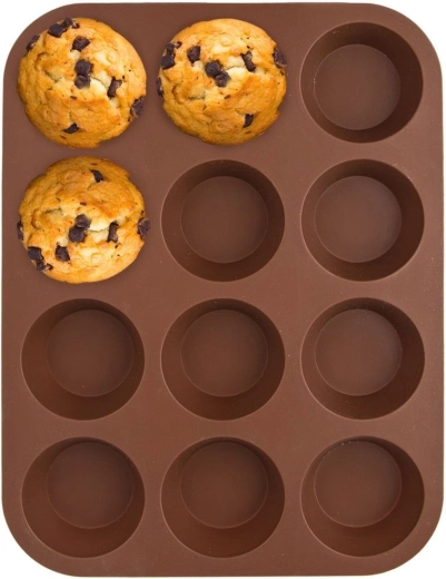Moule à muffins pratique en silicone pour 12 pièces de couleur marron. Grâce à son revêtement antiadhésif, la pâte se démoule facilement sans graissage. Résistant aux températures de -40 °C à +220 °C, adapté au four, micro-ondes, réfrigérateur et congélateur, et compatible lave-vaisselle. Léger, flexible et facile à nettoyer.