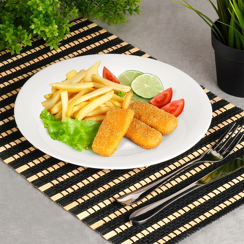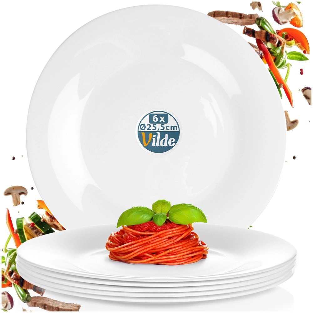 Élégant set de 6 assiettes plates de 25,5 cm de diamètre en verre opale résistant, de couleur blanche. Idéal pour le quotidien comme pour les tables de fête. Les assiettes sont légères, résistantes à la chaleur jusqu’à +100 °C, compatibles lave-vaisselle et micro-ondes. Le design minimaliste se marie parfaitement avec tout dressage de table.