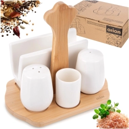 Élégant ensemble WHITELINE de 5 pièces combinant salière et poivrière en porcelaine, porte-serviettes et gobelet à cure-dents sur une base en bambou avec poignée au style raffiné. Idéal pour le quotidien comme pour les occasions festives, facile à nettoyer et s’accorde à tout dressage de table.