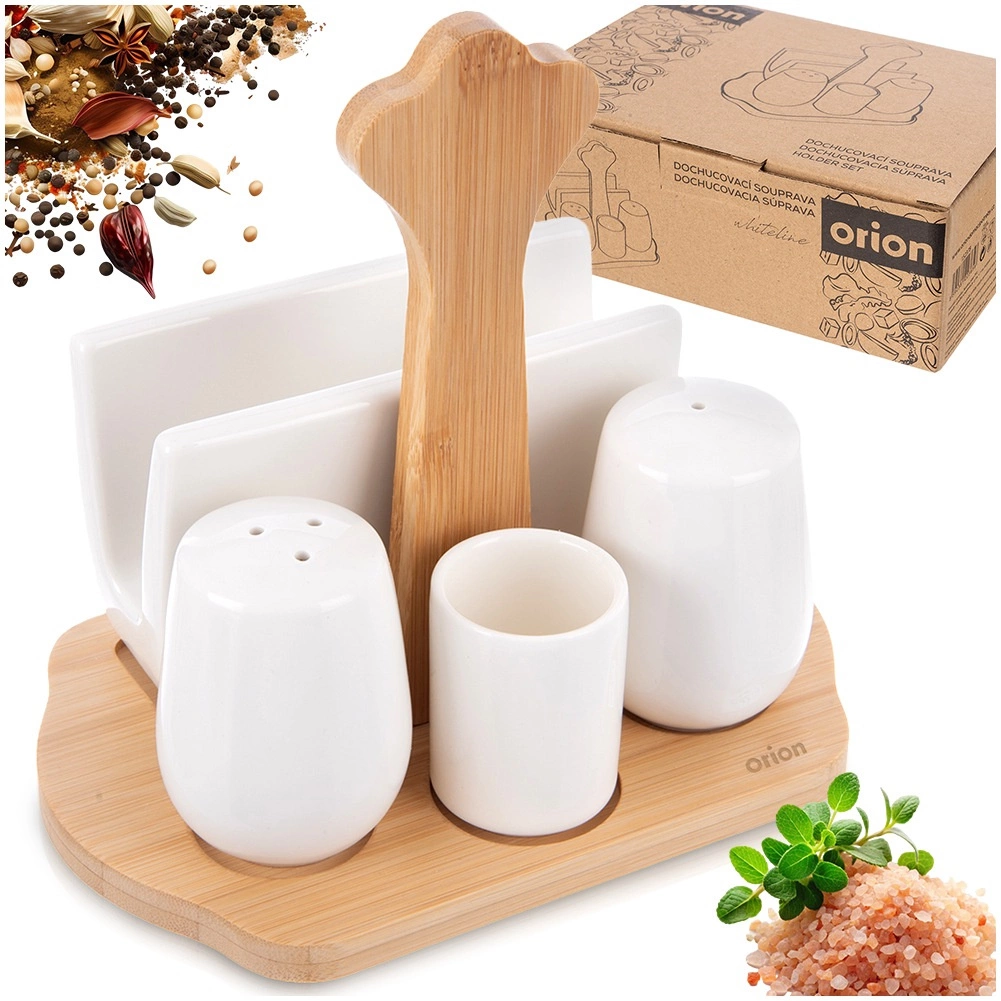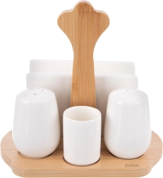 Ce set design pour condiments offre une organisation pratique du sel, du poivre, des serviettes et des cure-dents en un seul endroit. La céramique en porcelaine blanche émaillée au relief discret et le bambou naturel composent une combinaison intemporelle qui se distingue dans une salle à manger moderne ou classique.