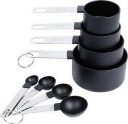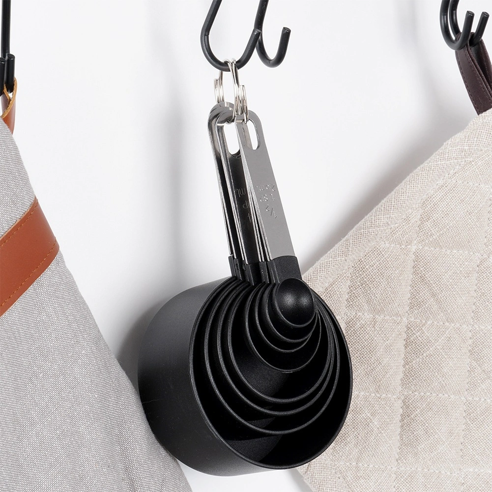 Les mesures disposent de poignées robustes en acier inoxydable et de bols en plastique de qualité dans une élégante couleur noire. Elles sont compatibles lave-vaisselle. Toutes les pièces sont reliées par un anneau métallique pour un accrochage facile et un rangement compact dans un tiroir.
