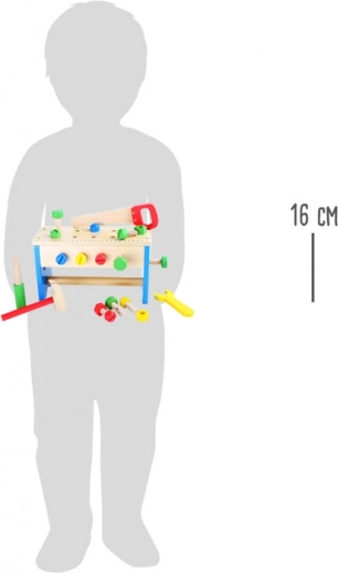 L’ensemble comprend une panoplie complète d’outils – tournevis, clé, marteau et scie – ainsi que des vis et écrous colorés pour d’innombrables combinaisons de vissage. Le jeu stimule les capacités de coordination, la pensée logique et la patience.