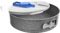 Ce moule rond à charnière avec couvercle est idéal pour cuire des gâteaux, cheesecakes et desserts froids. L’acier robuste avec revêtement granité antiadhésif évite l’adhérence et facilite le nettoyage. Le couvercle translucide doté d’une poignée bleue rabattable permet un stockage sécurisé et un transport confortable.