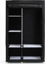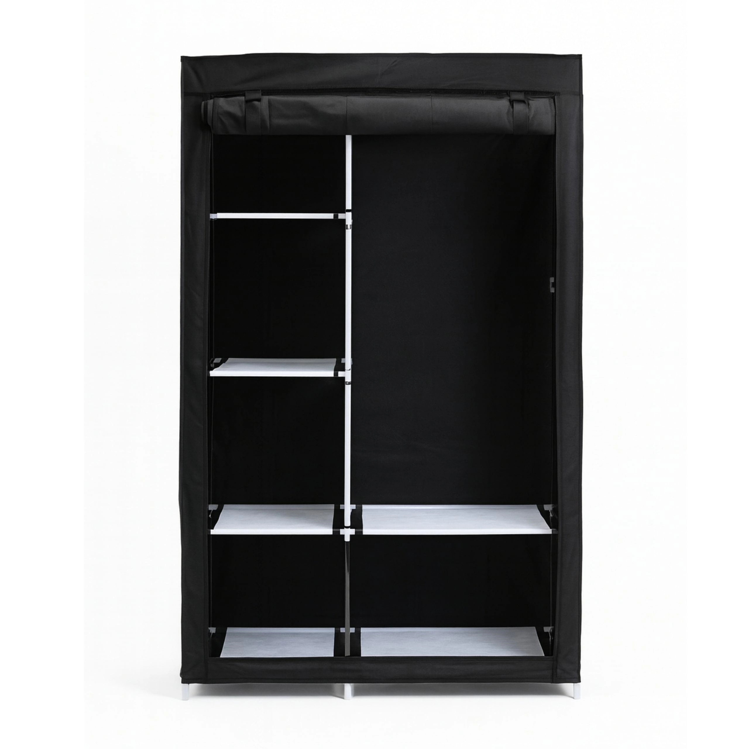 Armoire penderie en tissu légère et pratique, en noir élégant, offrant une structure stable, une protection des vêtements contre la poussière et une organisation bien pensée grâce aux étagères, poches latérales et à la tringle pour cintres. Idéale pour appartement, bureau ou chambre d’étudiant.
