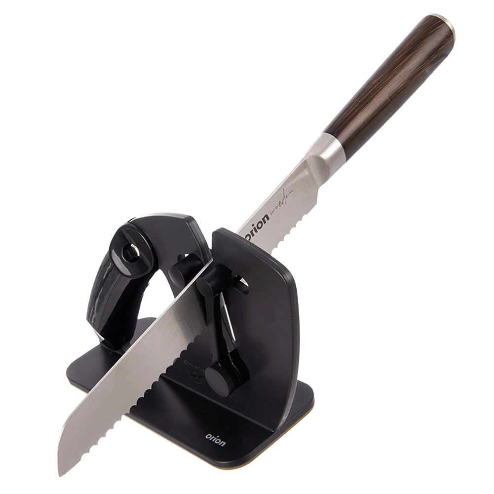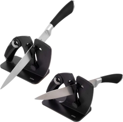 Le mécanisme à ressort s’adapte automatiquement à la lame et maintient le bon angle pour un affûtage homogène et délicat des couteaux lisses comme dentelés.