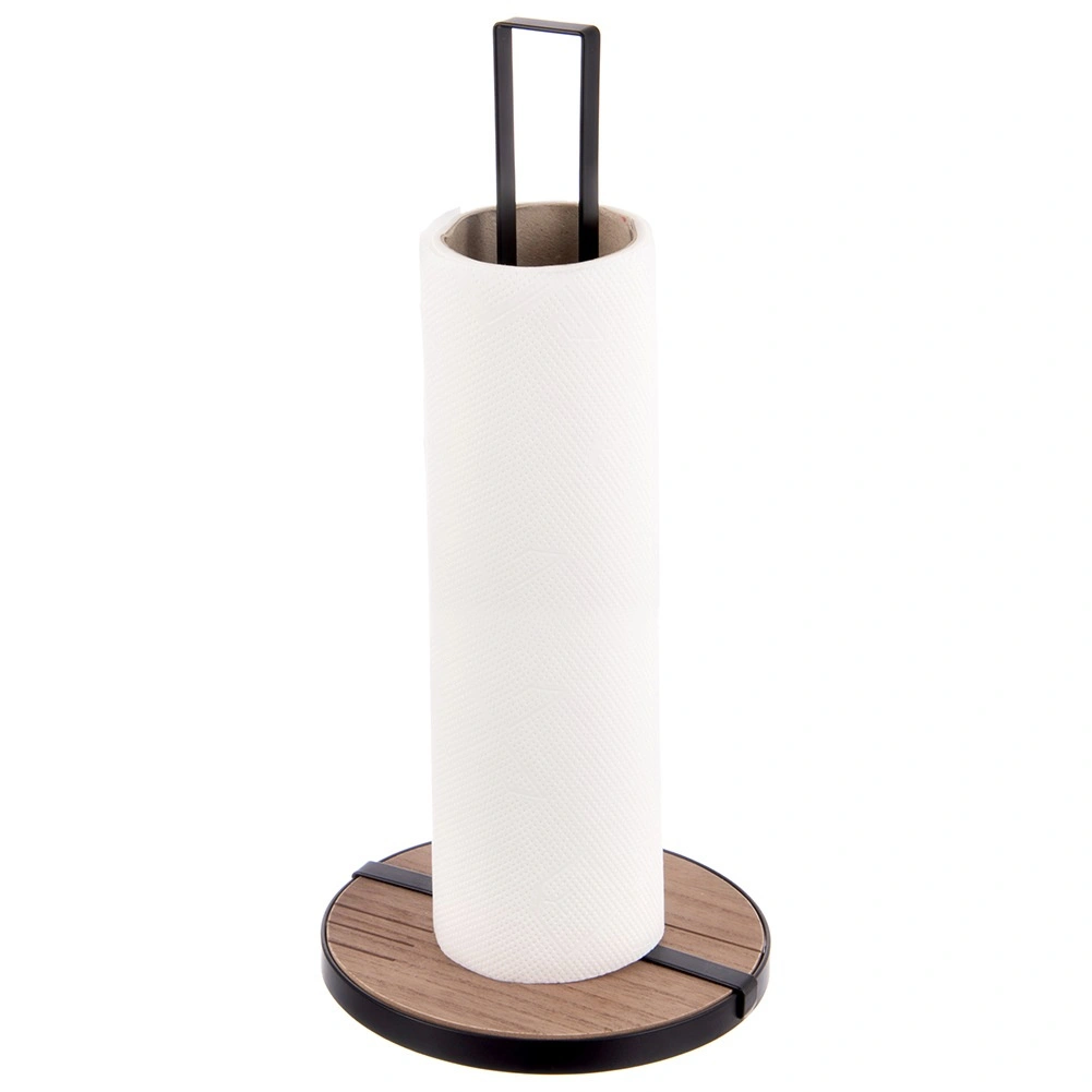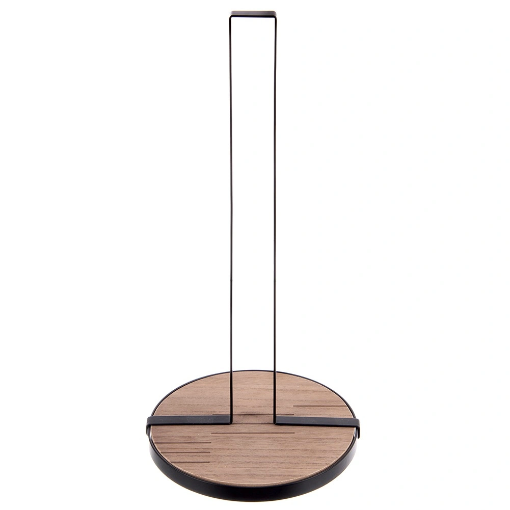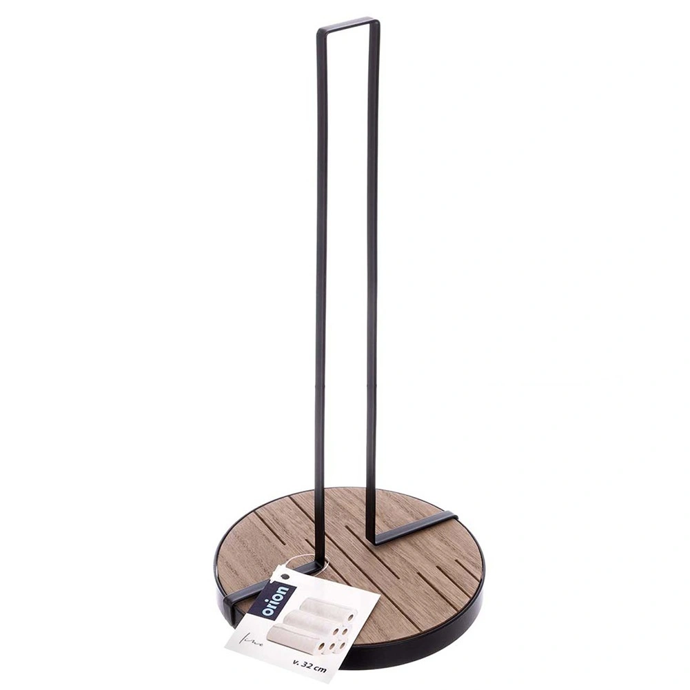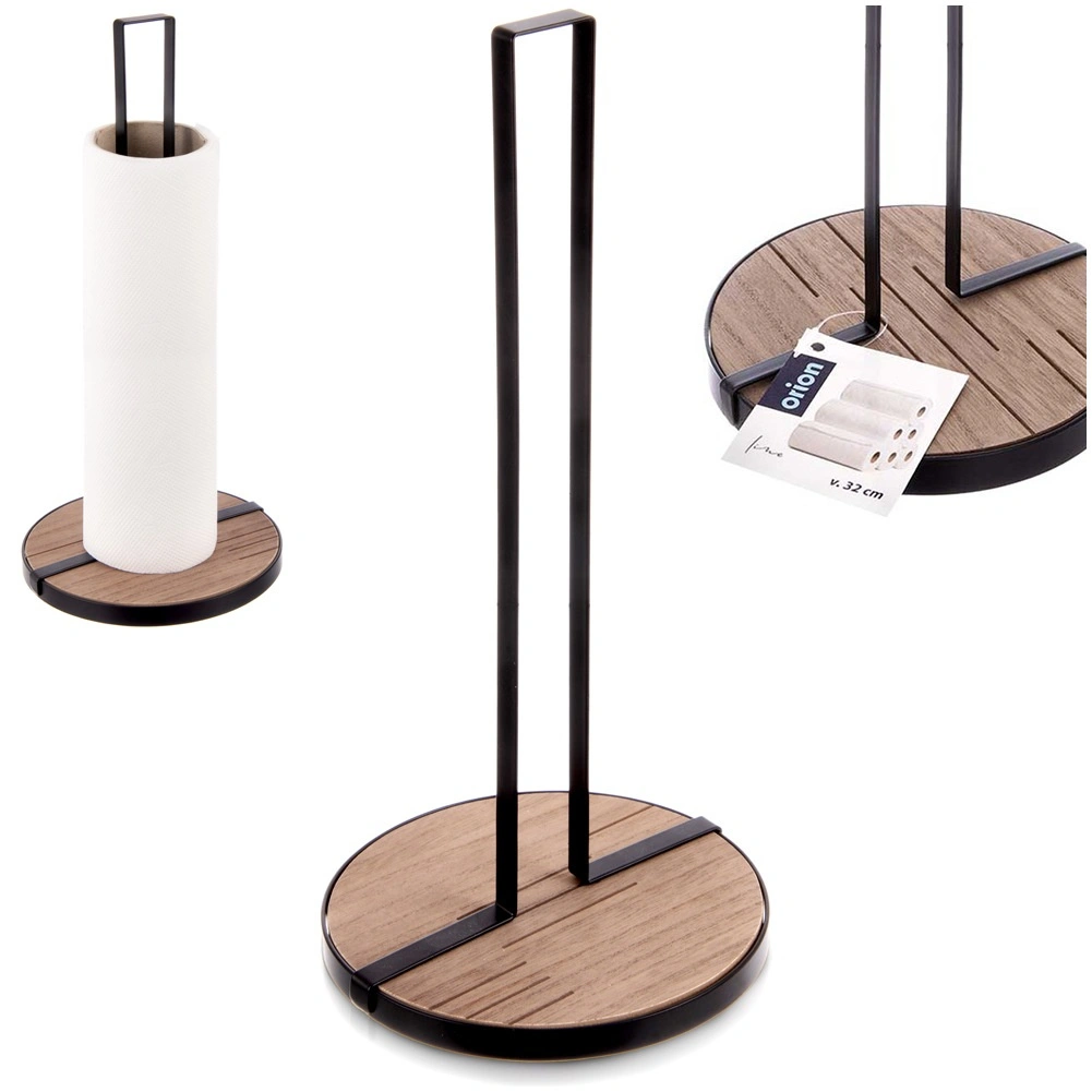 Le porte-essuie-tout LINE, de dimensions 15,5 × 15,5 × 32,5 cm, est un assistant pratique pour la cuisine quotidienne comme pour le ménage. Sa structure métallique robuste de couleur noire et sa base circulaire en MDF assurent une excellente stabilité et une longue durée de vie.