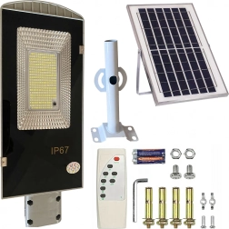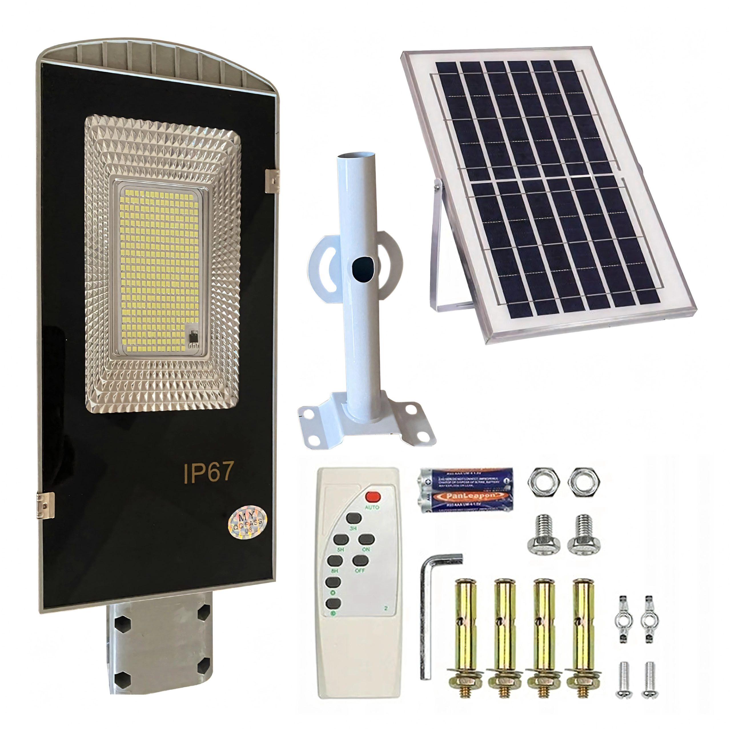 Puissante lampe solaire de jardin avec panneau de rue offrant jusqu’à 300 W, pour un éclairage intense grâce à 299 LED. Idéale pour le jardin, les allées et les cours – sans câbles, économe en énergie et facile à installer sur un poteau.