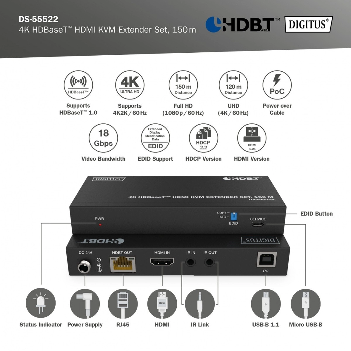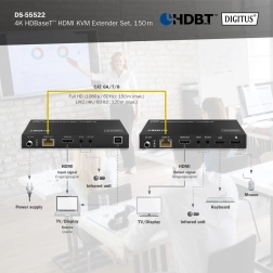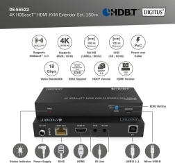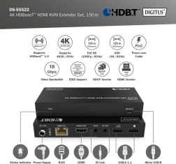 Extenseur HDMI professionnel avec technologie HDBaseT transmettant une vidéo non comprimée 4K à 60 Hz (4:4:4) sur de longues distances jusqu’à 150 m via câble réseau CAT6A/7/8. Il offre l’alimentation PoC (un seul module à alimenter), un IR bidirectionnel, la gestion EDID et un contrôle KVM pratique via deux ports USB sur le récepteur.