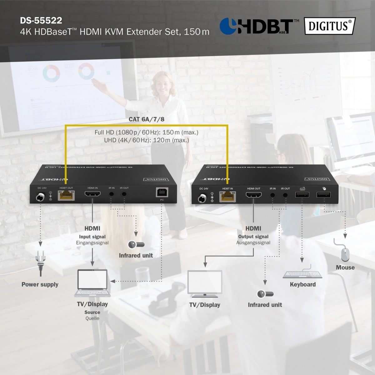 - Longue portée : jusqu’à 150 m en 1080p/60, jusqu’à 120 m en 4K/60 via CAT6A/7/8