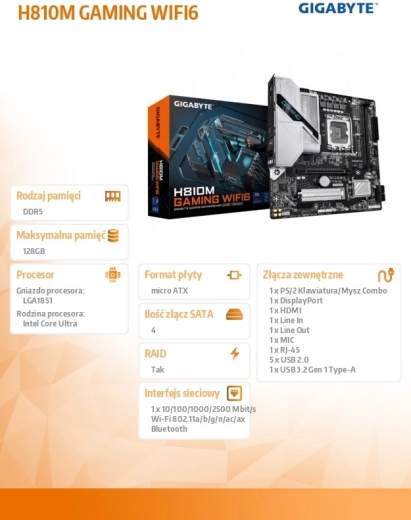 La H810M Gaming Wi‑Fi 6 est une carte mère fiable pour configurations gaming et professionnelles avec processeurs Intel Core Ultra (2e génération). Grâce à son accent sur une installation aisée et un refroidissement efficace, elle offre un équilibre idéal entre performance et confort. Le Wi‑Fi 6 intégré et le LAN 2,5 GbE assurent une connexion rapide et stable, tandis que les emplacements PCIe 4.0 M.2 offrent des chargements fulgurants du système et des jeux.