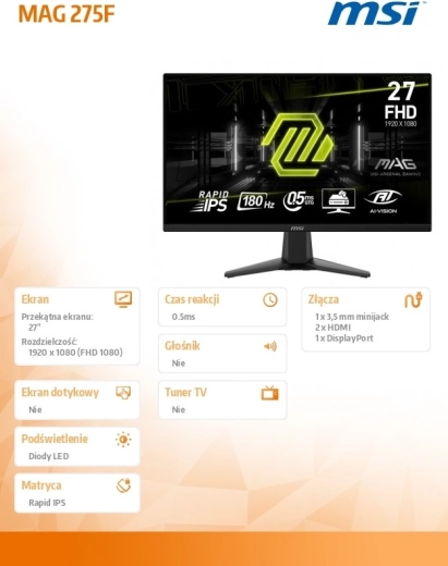 Le moniteur MAG 275F propose une combinaison idéale d’une diagonale de 27", d’une résolution Full HD et d’un taux de rafraîchissement élevé de 180 Hz pour une image réactive et de meilleures performances en jeu comme au travail. La dalle LED plate (Flat) garantit des couleurs vives et un affichage stable sans distorsion.