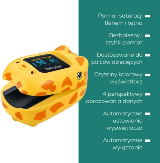 L’oxymètre de pouls pour enfants Beurer PO 13 Kids en adorable forme de girafe offre une mesure indolore de la saturation en oxygène (SpO2) et du pouls en quelques secondes. Il est adapté aux petits doigts d’enfants, dispose d’un écran couleur à orientation automatique et fournit des résultats fiables pour un contrôle de santé à domicile.