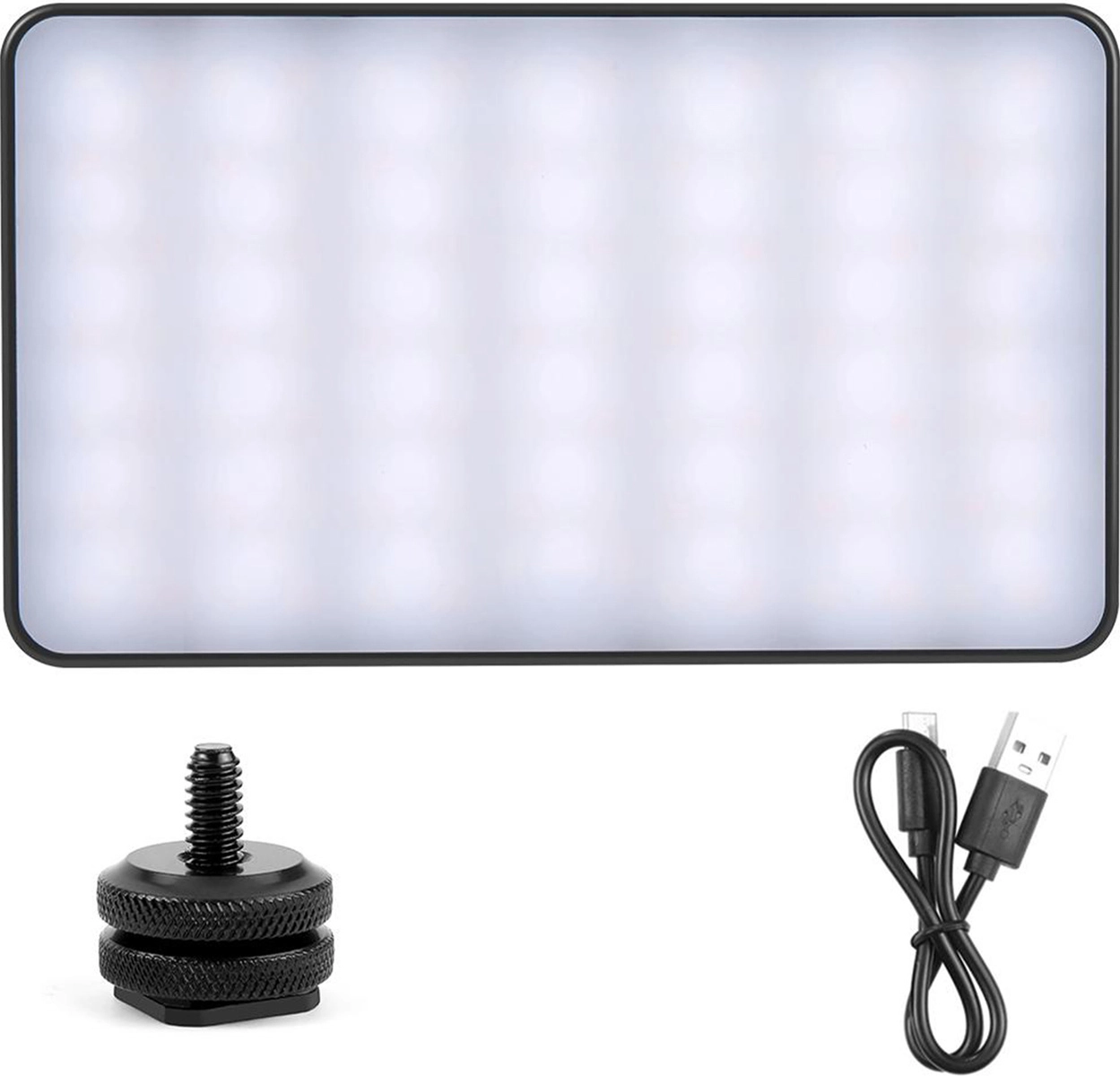 Contenu de l’emballage : lampe PULUZ, adaptateur 1/4" pour griffe froide, câble de charge USB‑C.