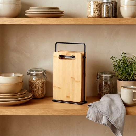 L’ensemble de planches en bambou est idéal pour la découpe quotidienne des légumes, fruits, pains et viandes. Grâce à leurs dimensions compactes, elles n’encombrent pas le plan de travail et le support garantit qu’elles restent toujours à portée de main et bien aérées pour une hygiène optimale. Leur aspect naturel intemporel s’intègre à toute cuisine.