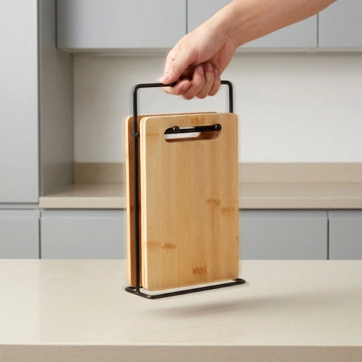 Le support métallique noir maintient les planches à la verticale, économise de la place sur le plan de travail et assure un rangement ordonné ainsi qu’un séchage rapide.