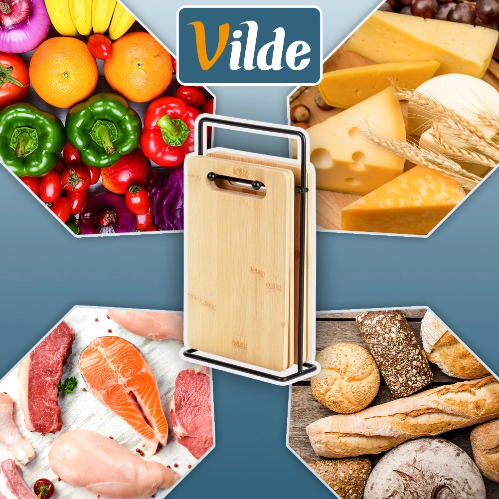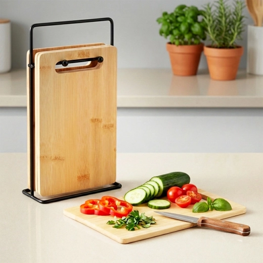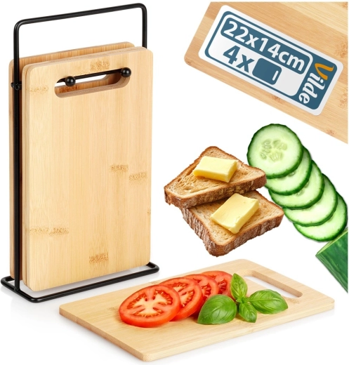 Les planches 22 × 14 × 0,7 cm tiennent bien en main et sont idéales pour les légumes, fruits, pains et petites portions de viande. Le support garde le tout réuni.