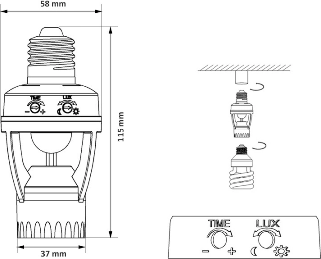 L’installation prend quelques minutes : il suffit de la visser dans la douille E27 existante et d’insérer l’ampoule. À l’aide des régulateurs rotatifs, vous réglez facilement le temps d’éclairage (TIME) et le seuil de luminosité (LUX). Le capteur utilise une détection infrarouge (PIR) et distingue de manière fiable le jour et la nuit, ce qui permet d’économiser de l’énergie et de réduire vos coûts.