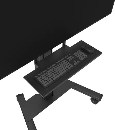 Le support d’étagère réglable en hauteur et les fixations arrière permettent un positionnement précis des périphériques sous l’écran pour un contrôle confortable.