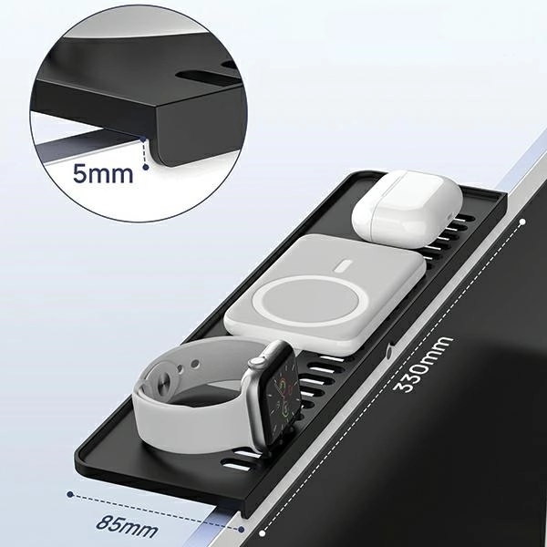 - Passage de câbles astucieux – découpes arrière pour faire passer élégamment les câbles de charge vers le téléphone, le casque ou la montre.