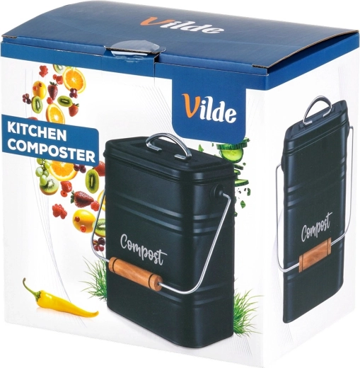 Composteur de cuisine élégant de 5 l en métal résistant, de couleur noire, idéal pour le tri quotidien des biodéchets directement sur le plan de travail. Grâce au filtre au charbon actif intégré dans le couvercle, il absorbe efficacement les odeurs, tandis que ses dimensions compactes et sa anse pratique avec poignée en bois facilitent le transport. Nettoyage facile et design intemporel avec l’inscription « Compost » qui s’intègre parfaitement à toute cuisine.