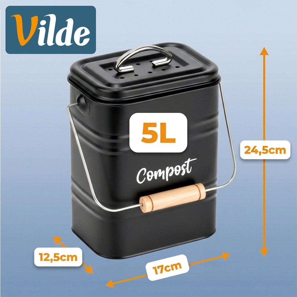 La structure métallique solide, au noir élégant, avec l’inscription « Compost », est résistante à une utilisation quotidienne. Le couvercle amovible avec orifices de ventilation limite l’accès aux insectes et la anse de transport avec poignée en bois facilite la manipulation.
