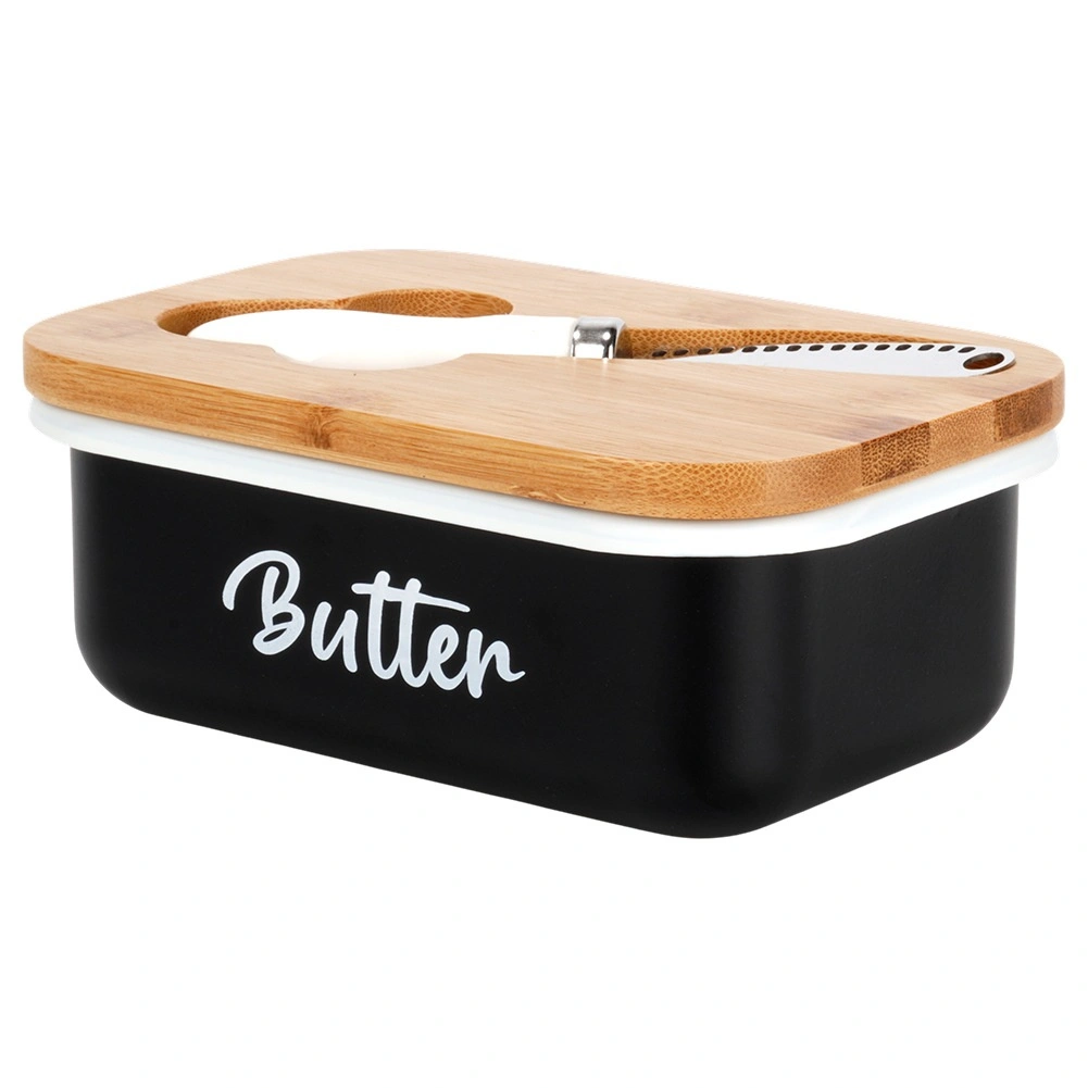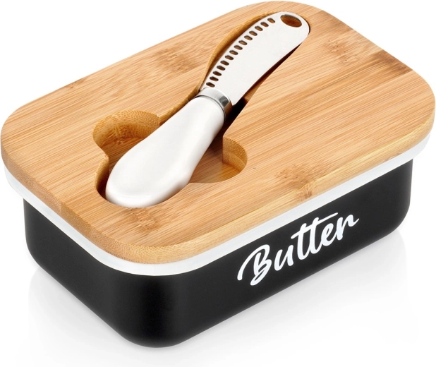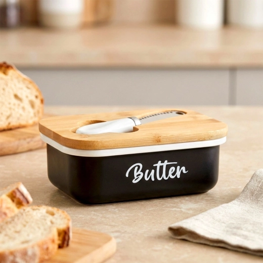 Un beurrier élégant pour un usage quotidien garde votre beurre longtemps frais et prêt à être servi. Il possède un corps en métal noir avec l’inscription Butter, un couvercle en bambou et un couteau en acier inoxydable pratique rangé directement dans le couvercle. Facile à nettoyer et, grâce à son design intemporel, il s’intègre à toute cuisine.