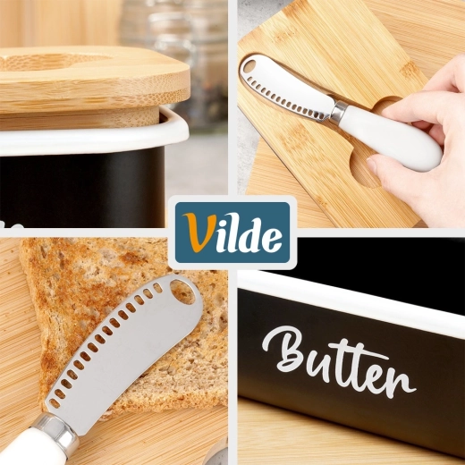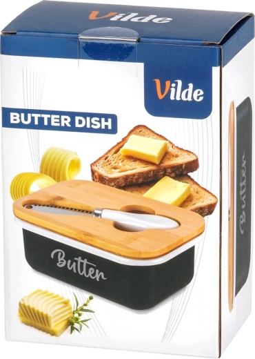 Le beurrier Vilde allie look moderne et praticité maximale. Le corps métallique noir avec l’inscription blanche Butter est complété par un couvercle en bambou naturel, qui aide à conserver le beurre frais plus longtemps et protégé. Une encoche intégrée dans le couvercle abrite le couteau fourni, pour tout avoir facilement à portée de main.